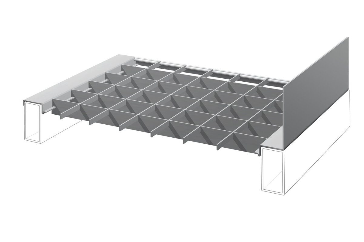 Whether pallets, pallet cages or special racks – our inlaid gratings are suitable for load carriers and pallet racks of all types. They can comfortably bear both uniformly distributed and point loads. Our gratings are recessed between traverses using suspension profiles. This ensures the full utilisation of the shelf height.